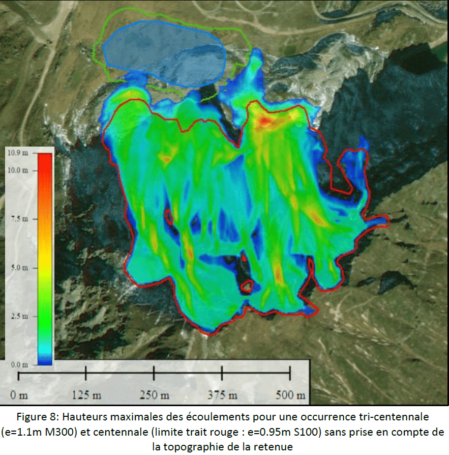 Le projet n’était que trop peu concerné par les risques d’avalanche ici, même en testant des scénarios très conservatifs. La retenue se situant bien en retrait des principales pentes nord du Rocher de la Loze. Pentes recouvertes de ‘’glaciers rocheux’’ constitués de gros blocs et de nombreux ressauts en contrebas qui contribuent de manière générale à retenir la majeure partie des écoulements.