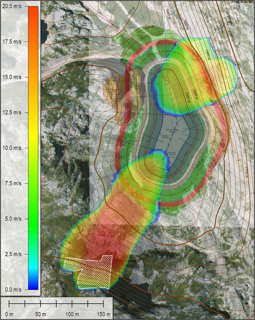 - A partir des données caractéristiques de l‘impact possible de l’avalanche sur la retenue, évaluer la vague qui pourrait être générer et son ‘’run-up’’ sur la rive opposée pour proposer une revanche suffisante et/ou des modalités de gestion (voire d’alerte) adaptées au régime d’utilisation de cette eau en début d’hiver